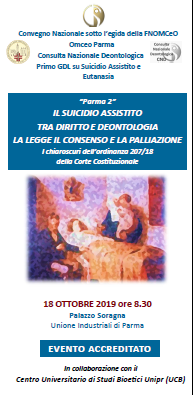| Il suicidio assistito tra diritto e deontologia. La legge il consenso e la palliazione | 18 Ott 2019 - 8:30 | Palazzo Soragna - Unione Industriali | | |