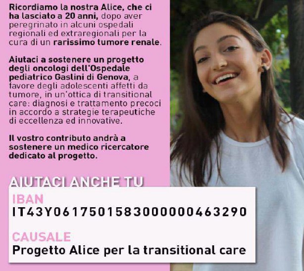 Informiamo che un nostro iscritto Collega Odontoiatra, il quale ha recentemente perso in brevissimo tempo la figlia studentessa del 1°Anno di Odontoiatria per una rara forma di tumore renale, ha promosso, per ricordarla, due meritorie iniziative: un asilo in Malawi sotto l’egida della comunità di San Benigno ed una Borsa di Studio per queste rare forme tumorali (vedi allegati con le due iniziative).